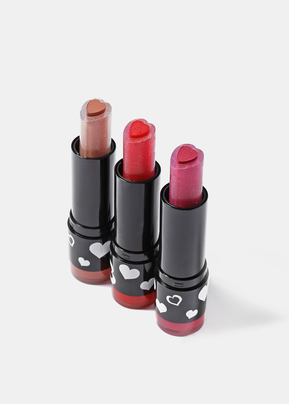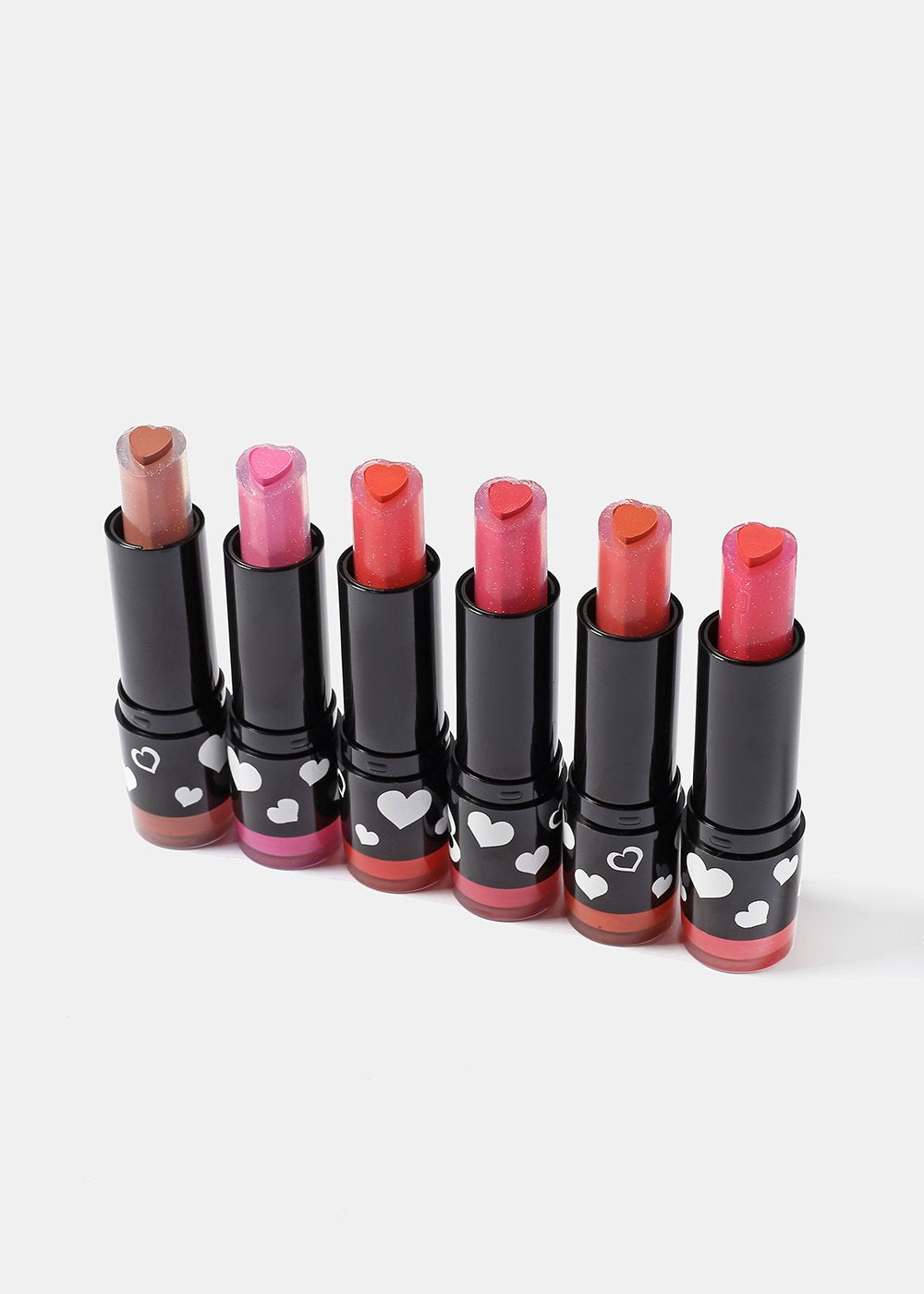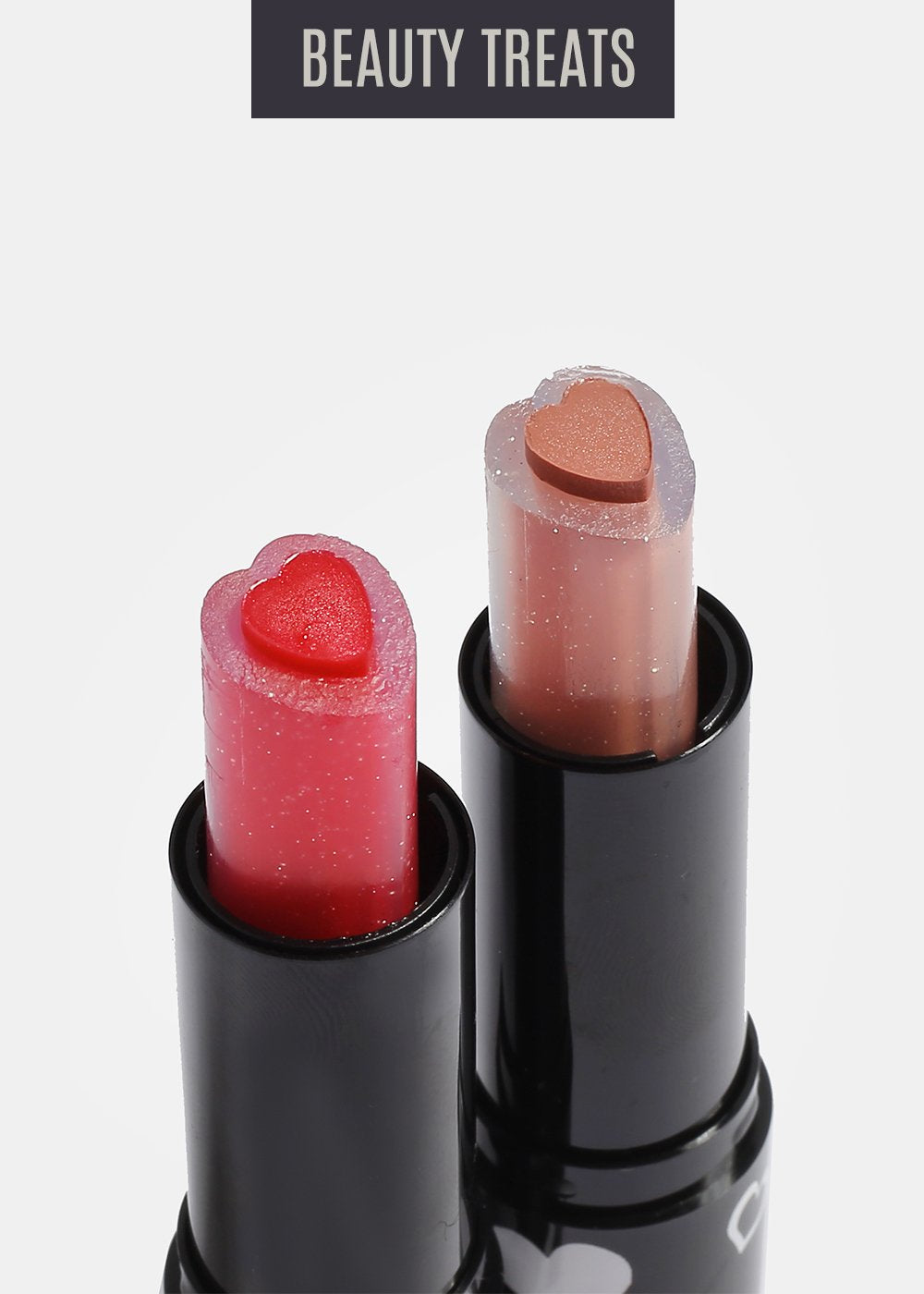 Cute 2 color lipsticks in a heart shape! Inside heart is the lipstick color and the outer edge is clear for a moisturized look!